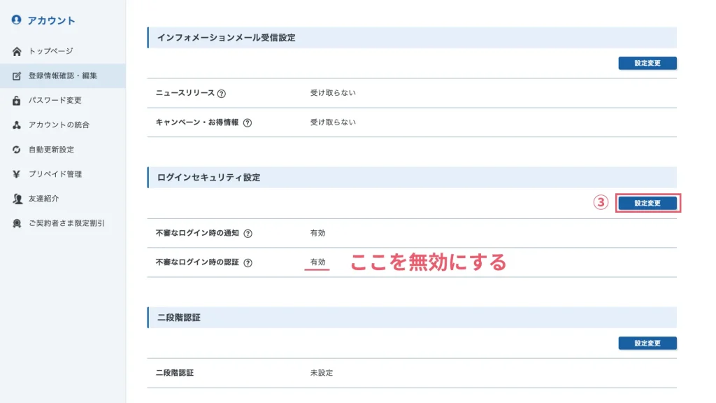 その中にある「不審なログイン時の認証」の項目右側にある【設定変更】ボタンをクリックします。