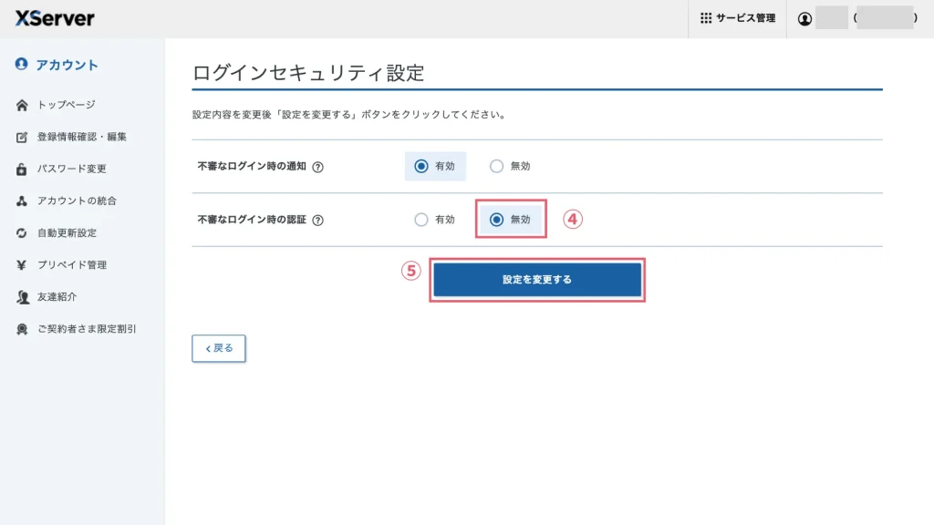 設定画面にて「不審なログイン時の認証」のラジオボタンを「無効」に切り替え、【設定を変更する】をクリックすれば完了です。